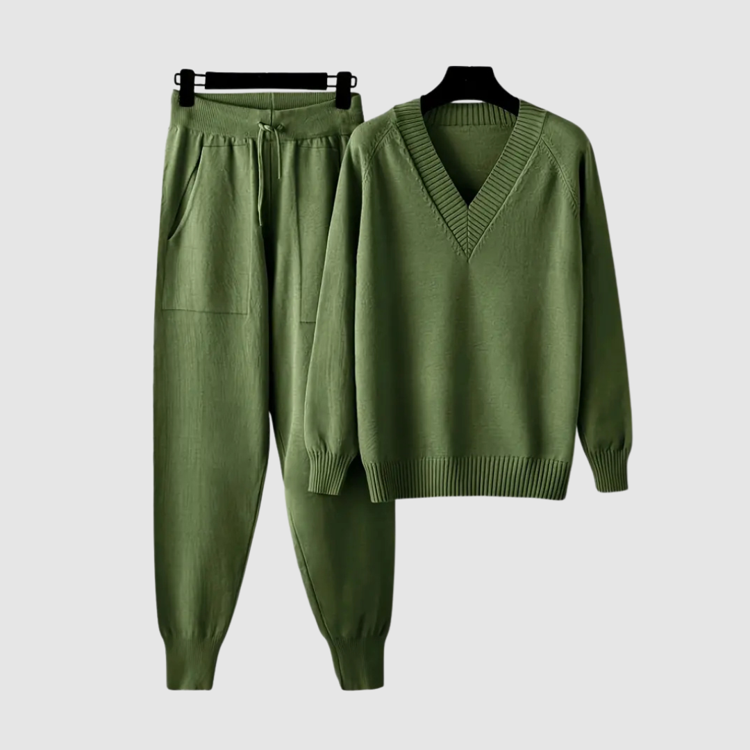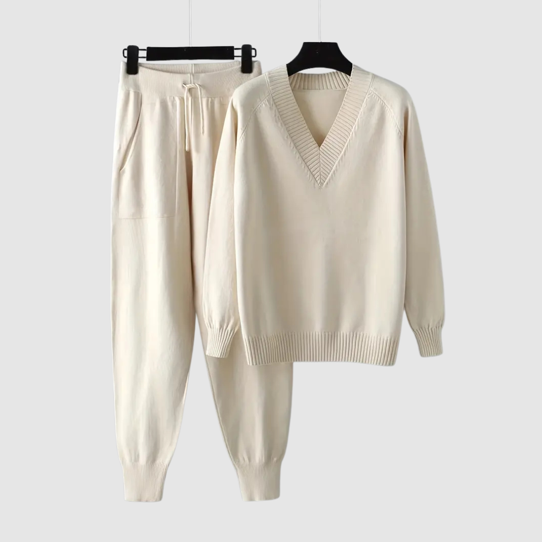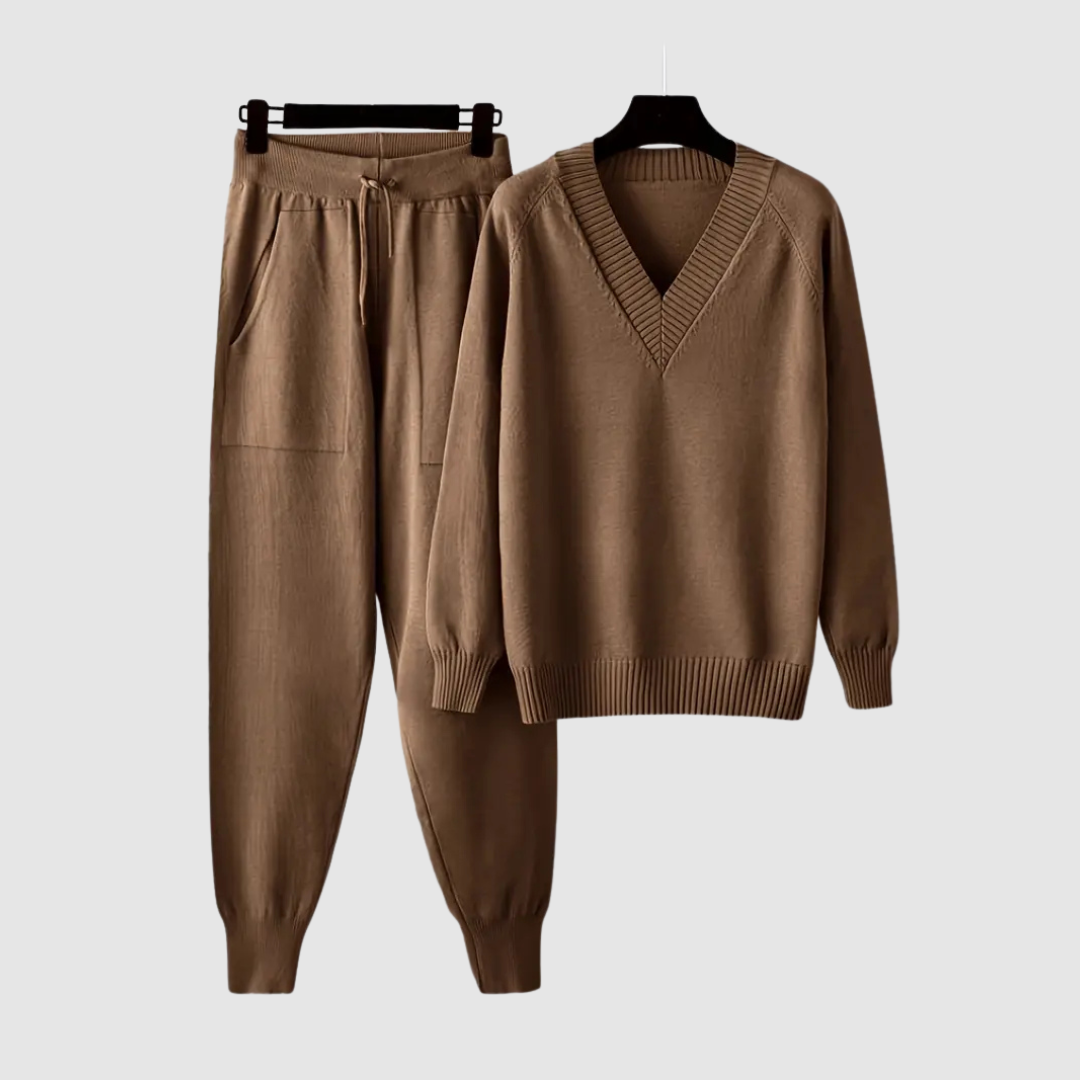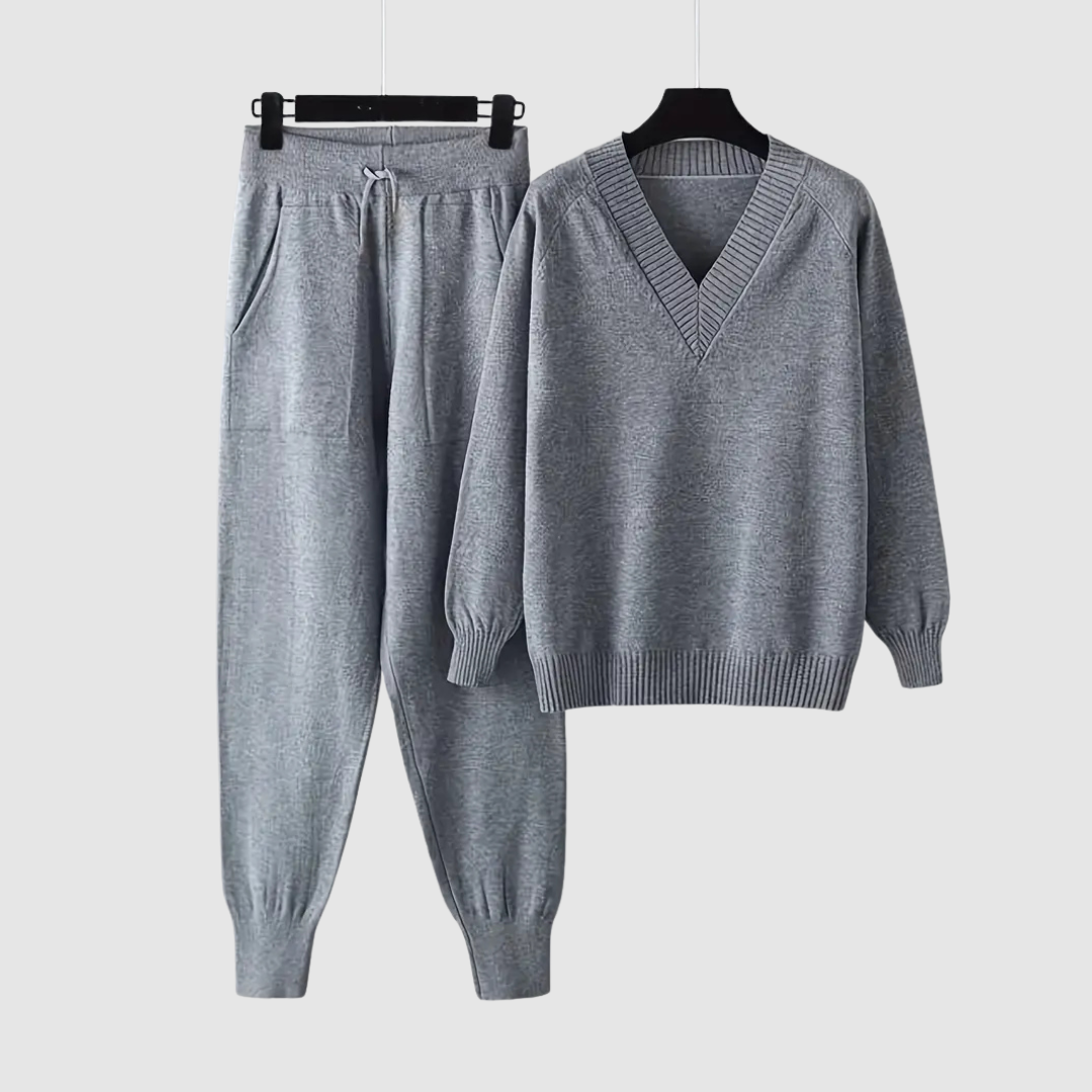 Tento komplet spojuje pohodlí a styl v jednom – svetr s výstřihem do V a volné kalhoty s elastickým pasem tvoří dokonalou kombinaci pro domácí pohodu i ležérní každodenní outfit. Je navržen tak, aby poskytoval maximální komfort bez kompromisu na eleganci.