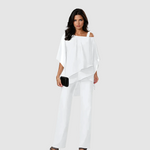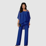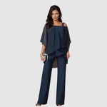 Tento komplet je ideální volbou pro společenské příležitosti i večerní události. Volná tunika s vrstveným efektem dodává lehkost a sofistikovanost, zatímco rovné kalhoty prodlužují siluetu a zajišťují elegantní vzhled.